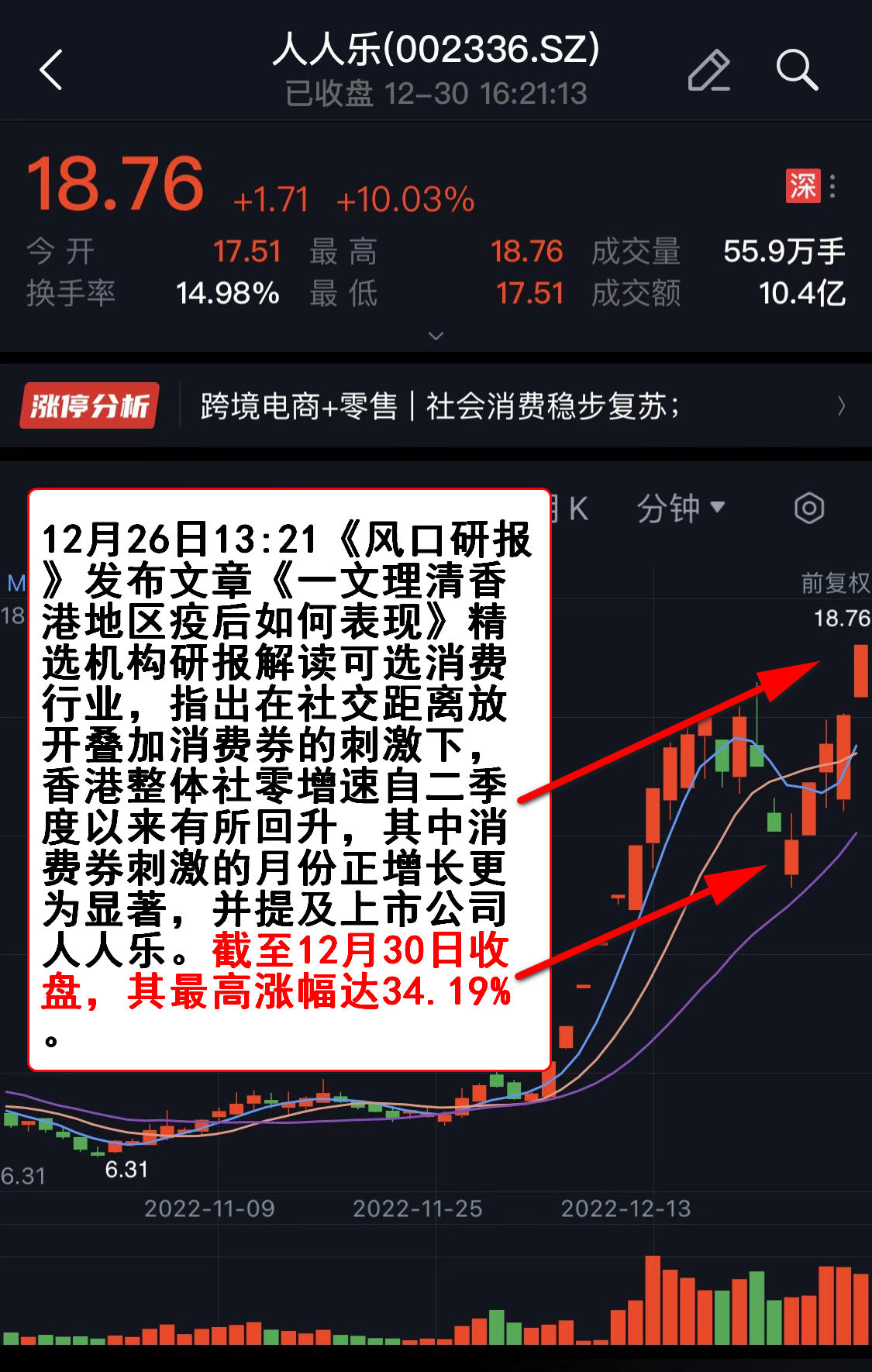 12月26日13:21《风口研报》发布文章《一文理清香港地区疫后如何表现》精选机构研报解读可选消费行业,指出在社交距离放开叠加消费券的刺激下,香港整体社零增速自二季度以来有所回升,其中消费券刺激的月份正增长更为显著,并提及上市公司人人乐。截至12月30日收盘,其最高涨幅达34.19%。