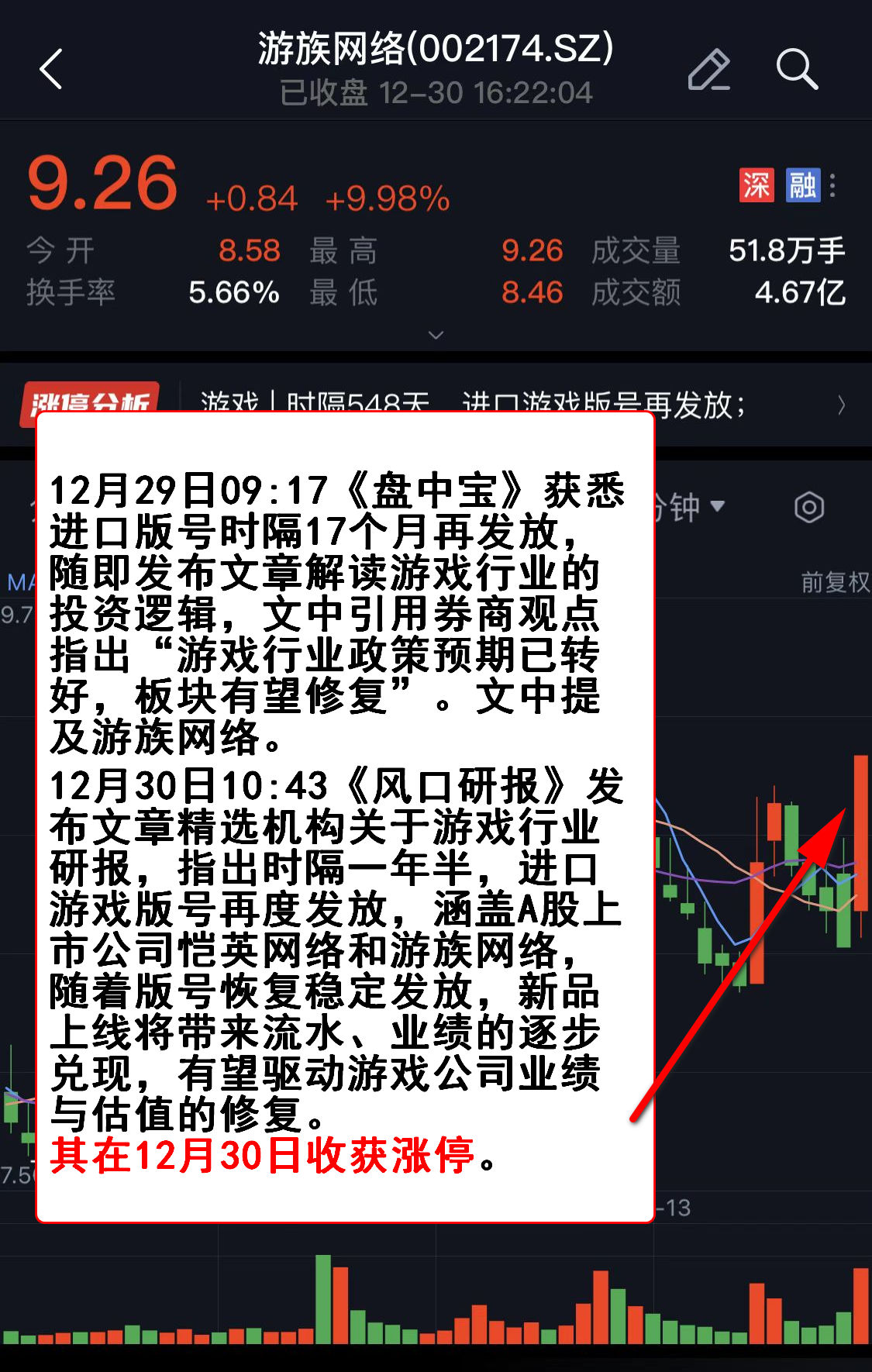 12月29日09:17《盘中宝》获悉进口版号时隔17个月再发放,随即发布文章解读游戏行业的投资逻辑,文中引用券商观点指出“游戏行业政策预期已转好,板块有望修复”。文中提及游族网络。