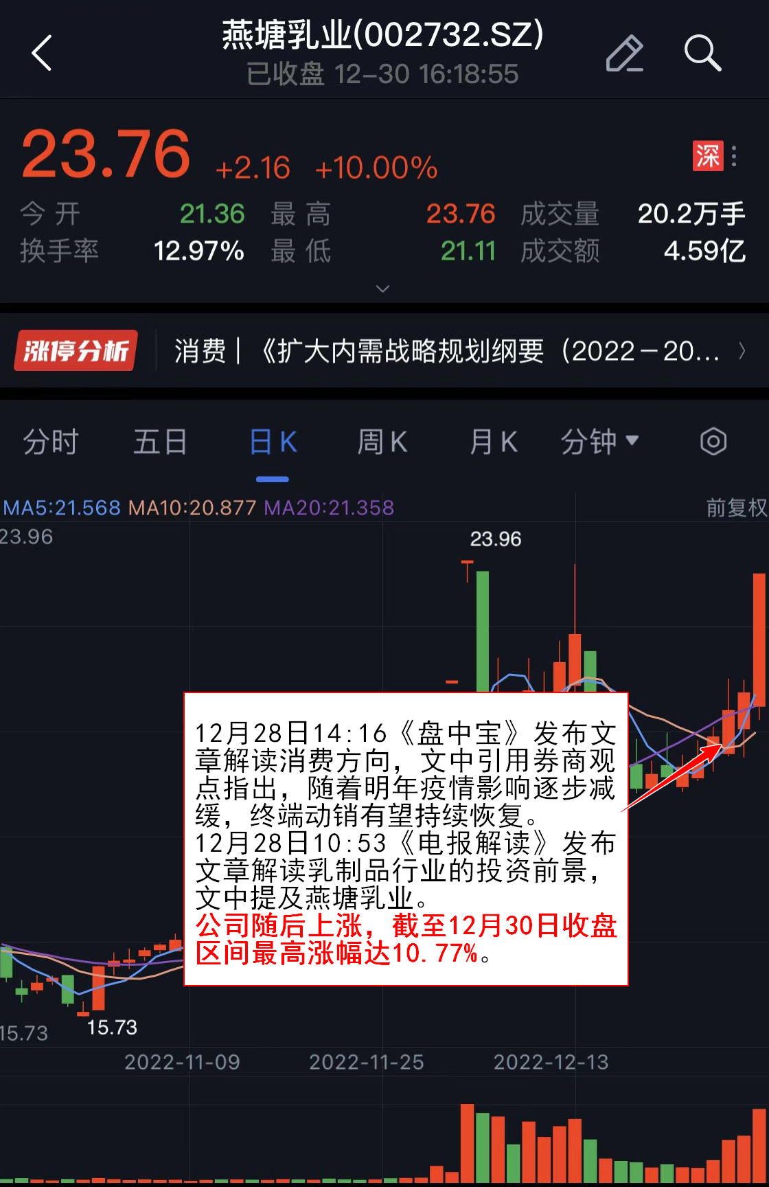 12月28日10:53《电报解读》发布文章解读乳制品行业的投资前景,文中提及燕塘乳业。公司随后上涨,截至12月30日收盘区间最高涨幅达10.77%。