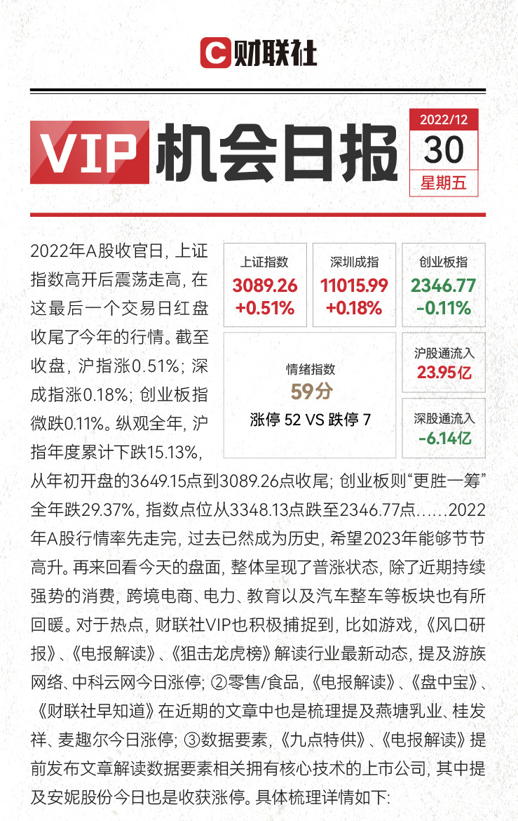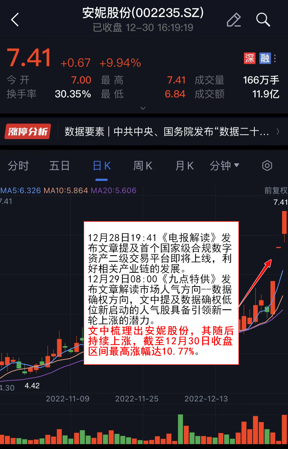 文中梳理出安妮股份,其随后持续上涨,截至12月30日收盘区间最高涨幅达10.77%。