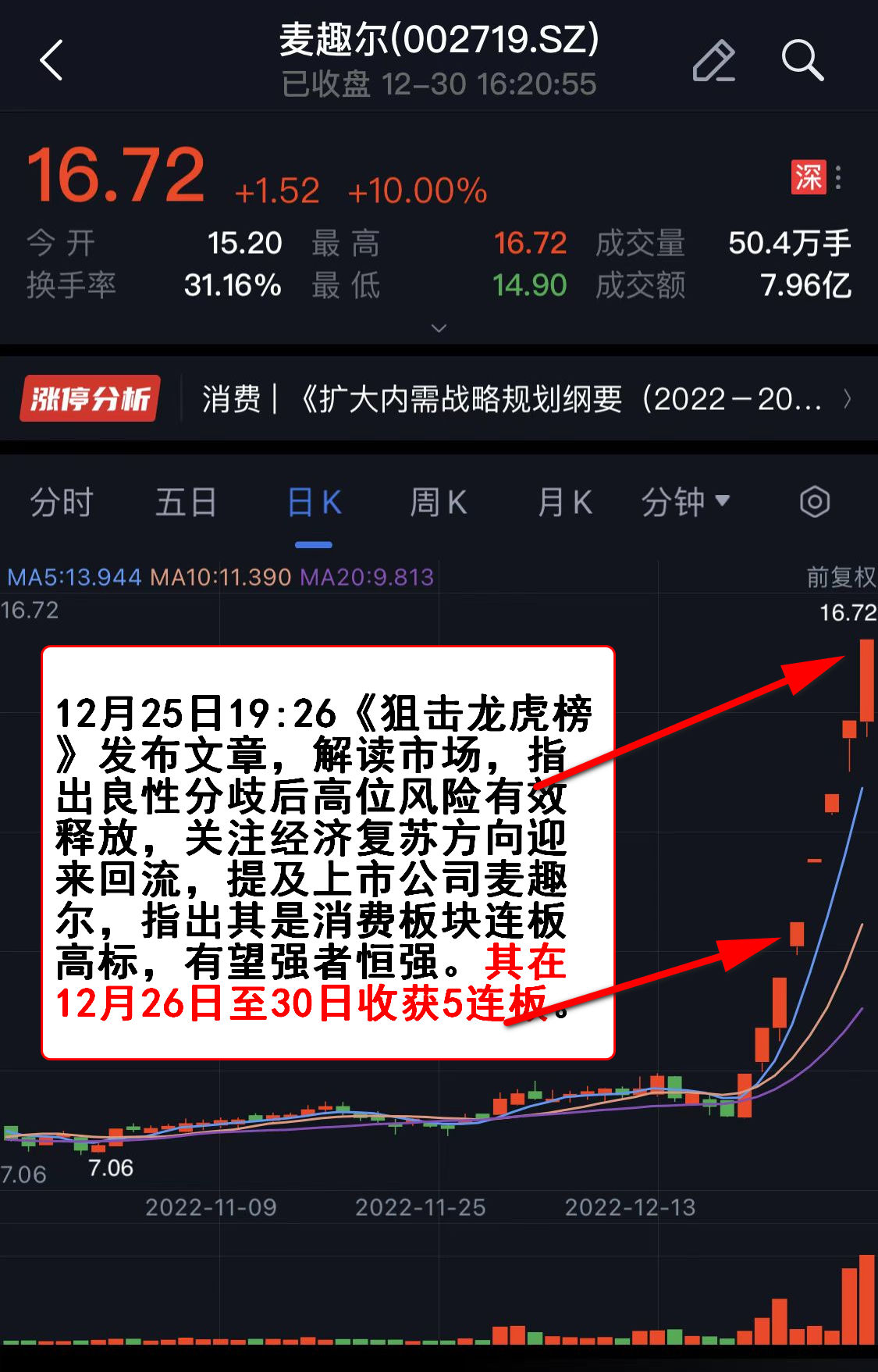 12月25日19:26《狙击龙虎榜》发布文章解读市场,指出良性分歧后高位风险有效释放,关注经济复苏方向迎来回流,提及上市公司麦趣尔,指出其是消费板块连板高标,有望强者恒强。其在12月26日至30日收获5连板。