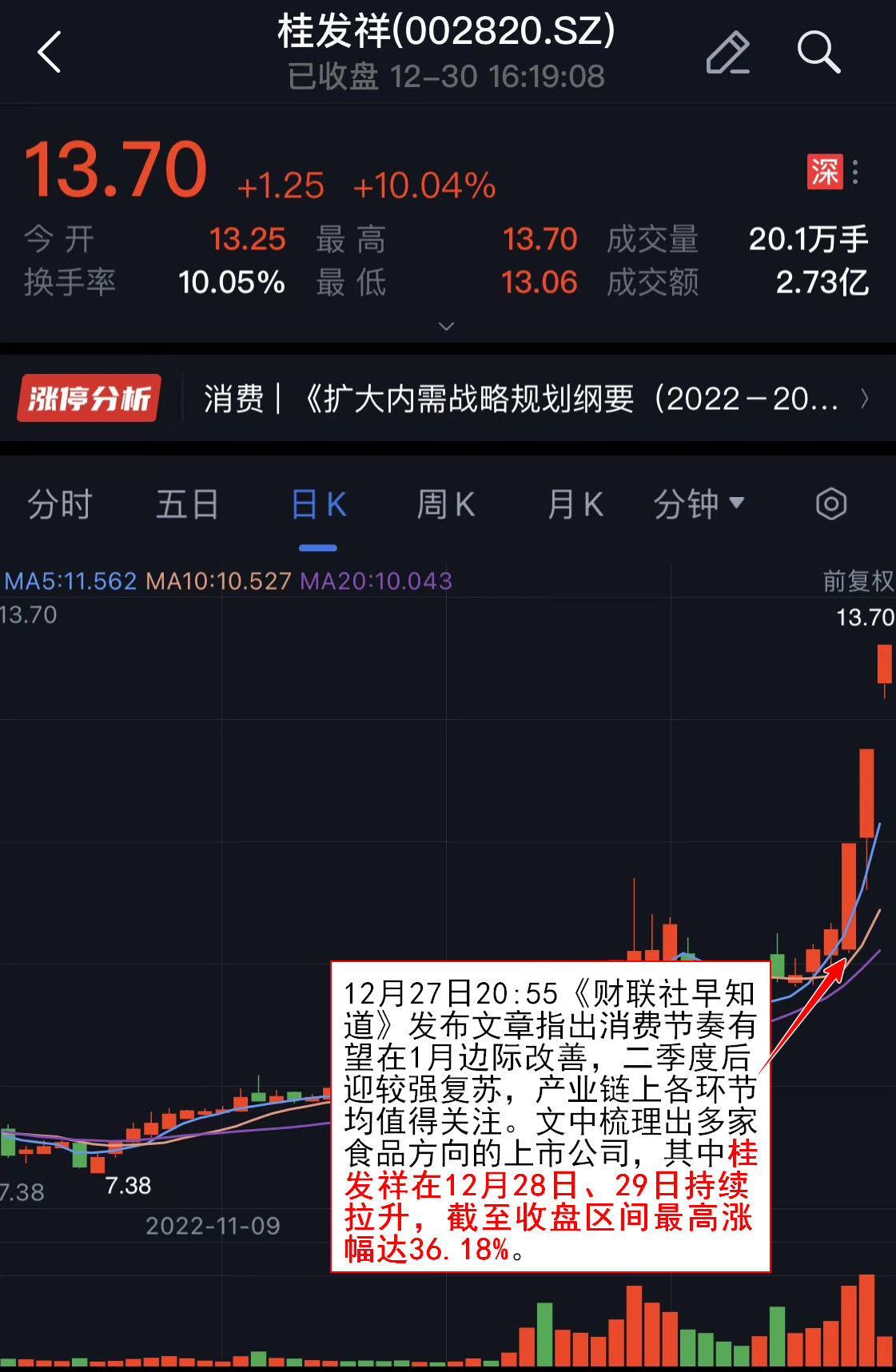 12月27日20:55《财联社早知道》发布文章指出消费节奏有望在1月边际改善,二季度后迎较强复苏,产业链上各环节均值得关注。文中梳理出多家食品方向的上市公司,其中桂发祥在12月28日、29日持续拉升,截至收盘区间最高涨幅达36.18%。