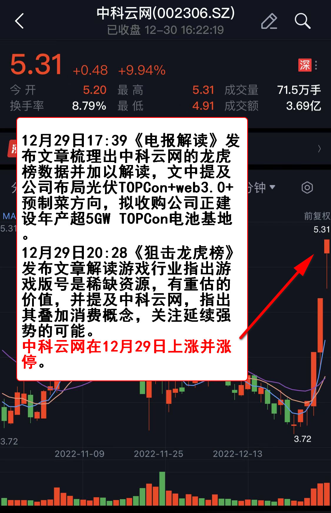 12月29日17:39《电报解读》发布文章梳理出中科云网的龙虎榜数据并加以解读,文中提及公司布局光伏TOPCon+web3.0+预制菜方向,拟收购公司正建设年产超5GW TOPCon电池基地。