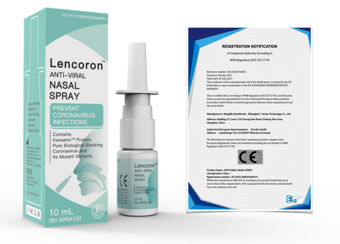 康码生物围绕康斯汀蛋白为核心原料,陆续推出了栏冠蛋白空气防护喷雾,栏冠蛋白口腔防护喷雾、栏冠口罩伴侣等公共防疫产品系列后,更进一步推出了一款针对海外市场的符合欧盟CE医疗器械指令的鼻腔喷雾产品——LencoronTM ANTI-VIRAL NASAL SPRAY(栏冠鼻腔抗病毒喷雾)。