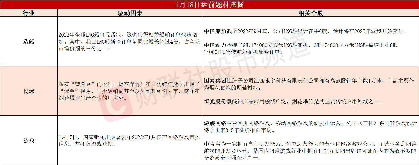【盘前题材挖掘】①订单排到2028年!我国LNG船新接订单量同比增长超4倍;②经销商蹲守在厂房外抢货,烟花爆竹厂出现“爆单”现象;③版号来了!多款重磅游戏获批,将为上市公司业绩带来有力催化。