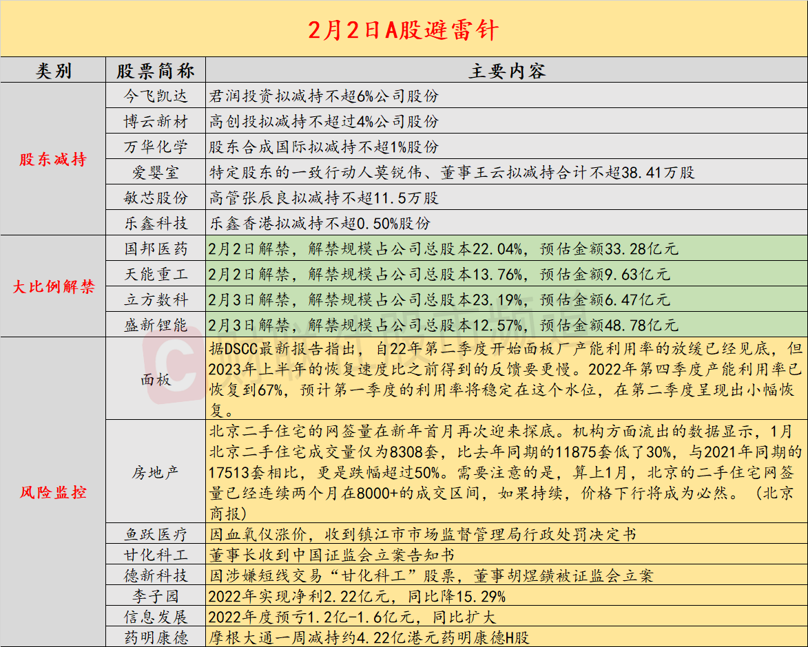 【2月2日股市避雷针】昨日A股拟减持规模较之前有所减少,今飞凯达股东君润投资拟减持不超6%公司股份,博云新材股东高创投拟减持不超过4%公司股份;国邦医药、立方数科将迎来超二成以上解禁;仅8300套,新年北京首月二手住宅网签量再探底;鱼跃医疗因血氧仪涨价,收到镇江市市场监督管理局行政处罚决定书;DSCC报告指出,2023年一季度面板厂产能利用率的恢复低于预期;甘化科工董事长收到中国证监会立案告知书;WTI 原油期货与布伦特原油期货双双跌超3%。