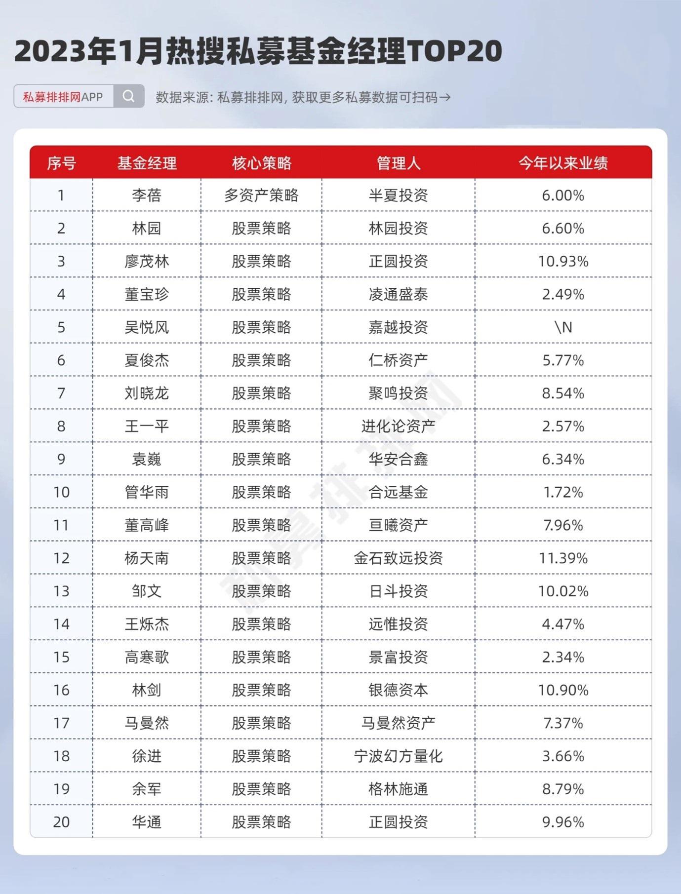 以1月受热搜的基金经理来看,私募排排网数据显示,1月人气私募基金经理前十分别为李蓓、林园、廖茂林、董宝珍、吴悦风、夏俊杰、刘晓龙、王一平、袁巍、管华雨,热搜私募基金经理前二十名今年来均实现正收益,其中廖茂林领跑。
