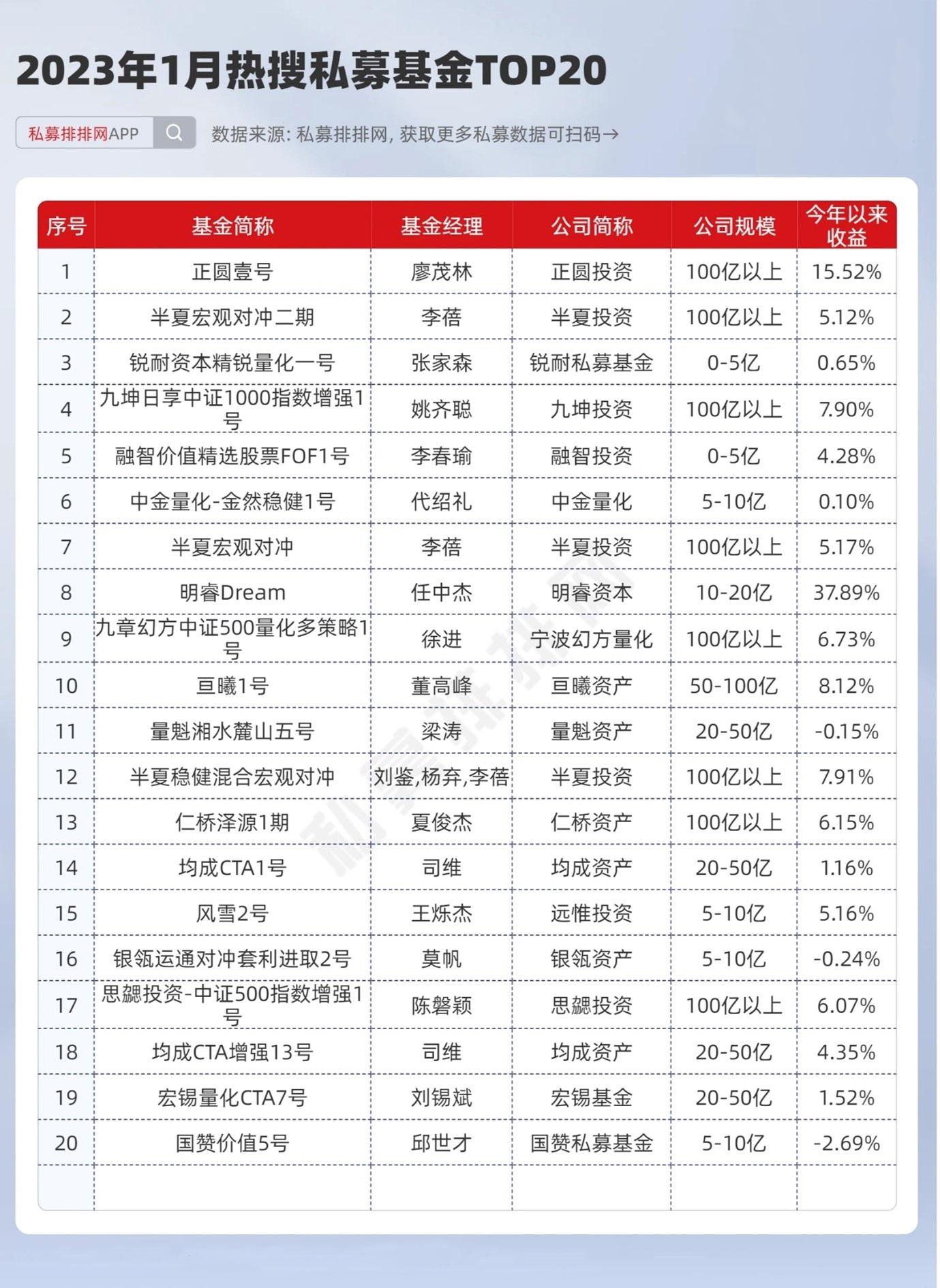 根据私募排排网发布的热搜私募榜单,2023年1月1日至1月31日期间,以用户搜索次数的加总数量进行排名。正圆投资、正圆壹号、李蓓(半夏投资)分别成为1月热搜私募基金、私募基金产品、私募基金经理人气冠军。