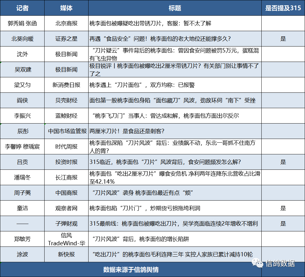 除此之外,我们梳理本次事件重要媒体报道16篇,发现其中提及315的文章共4篇(标题提及2篇,内容提及2篇),报道媒体为证券之星、投资时报、观察者网、子弹财经。