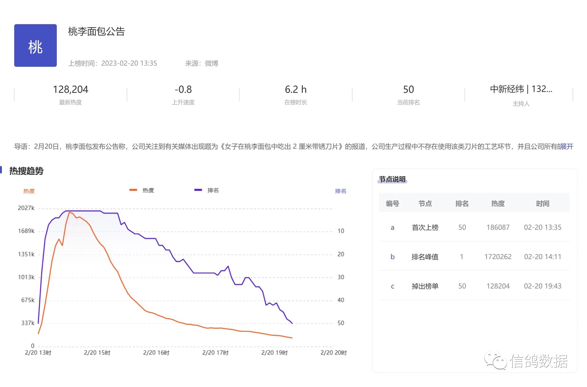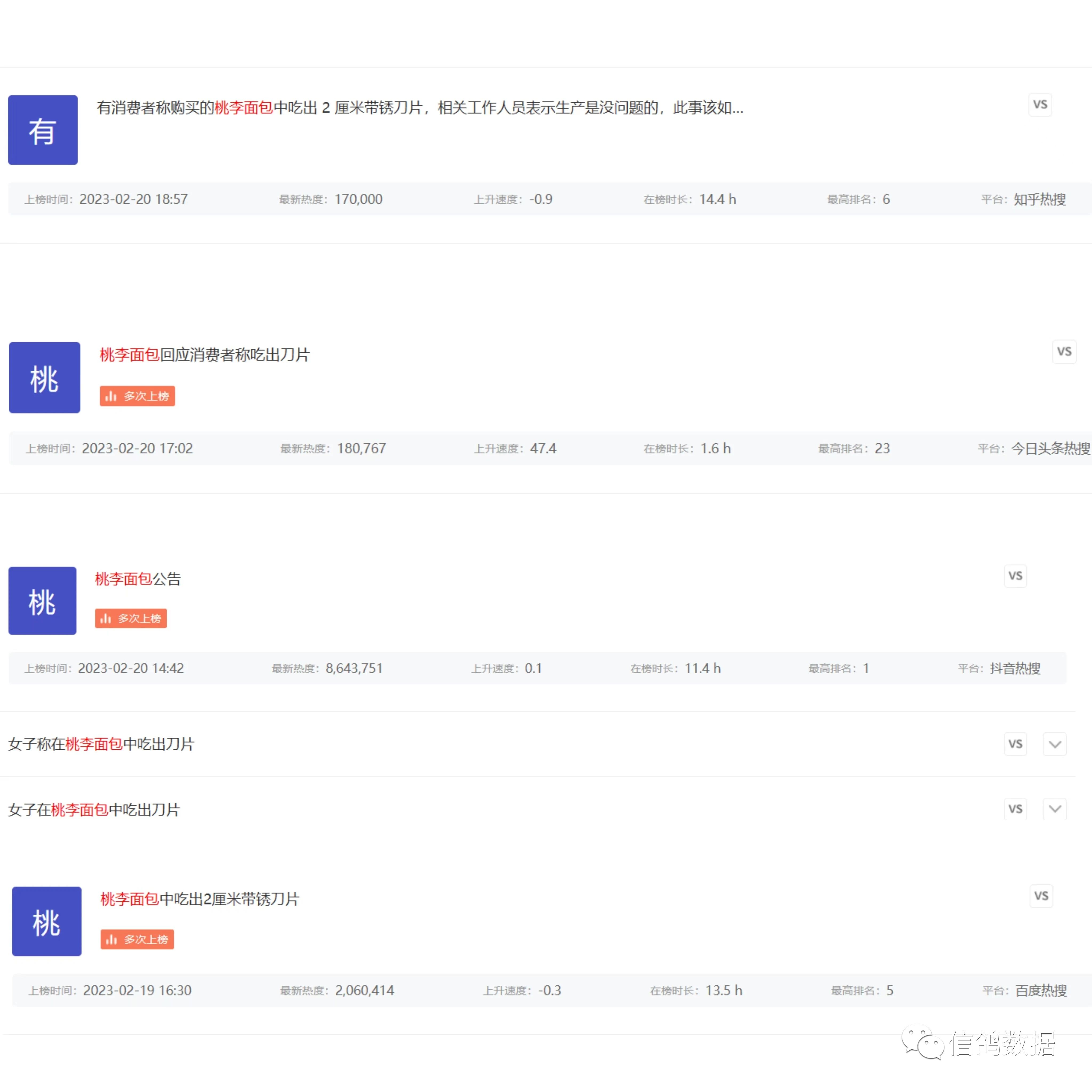 信鸽数据选取2月18日-2月22日,全网提及“桃李面包+刀片”相关信息进行分析梳理,详细情况如下: