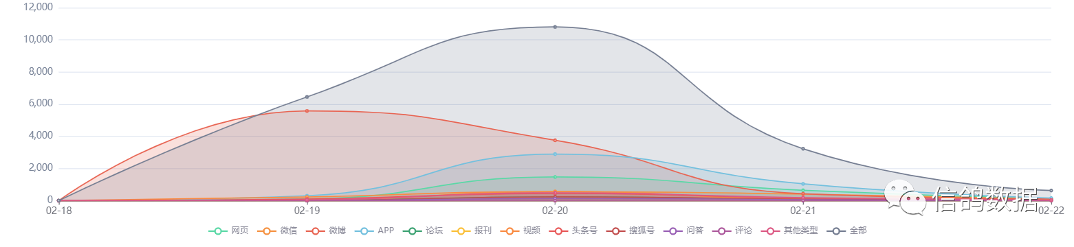 2月18日-2月22日,全网提及桃李面包“刀片门”数据共21144条,从整体热度看2月20日为舆情高热点,当天桃李面包正面回应了事件并公告说明。