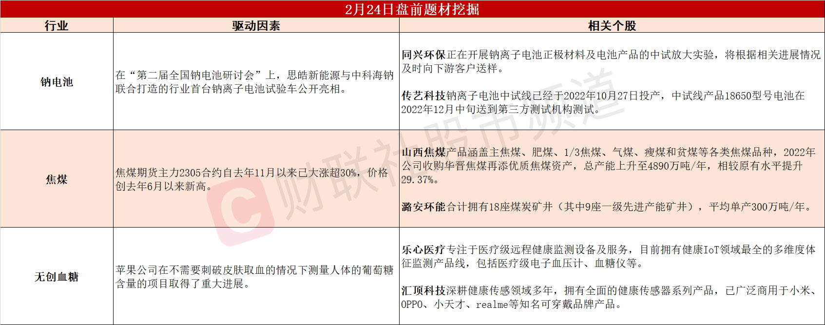 【盘前题材挖掘】①首台钠离子电池试验车公开亮相,钠电池产业化蓄势待发;②价格刷新去年6月以来新高,焦煤供给端几乎无新增产能;③苹果无创血糖项目取得重大进展,智能可穿戴设备或迎新的发展机遇。