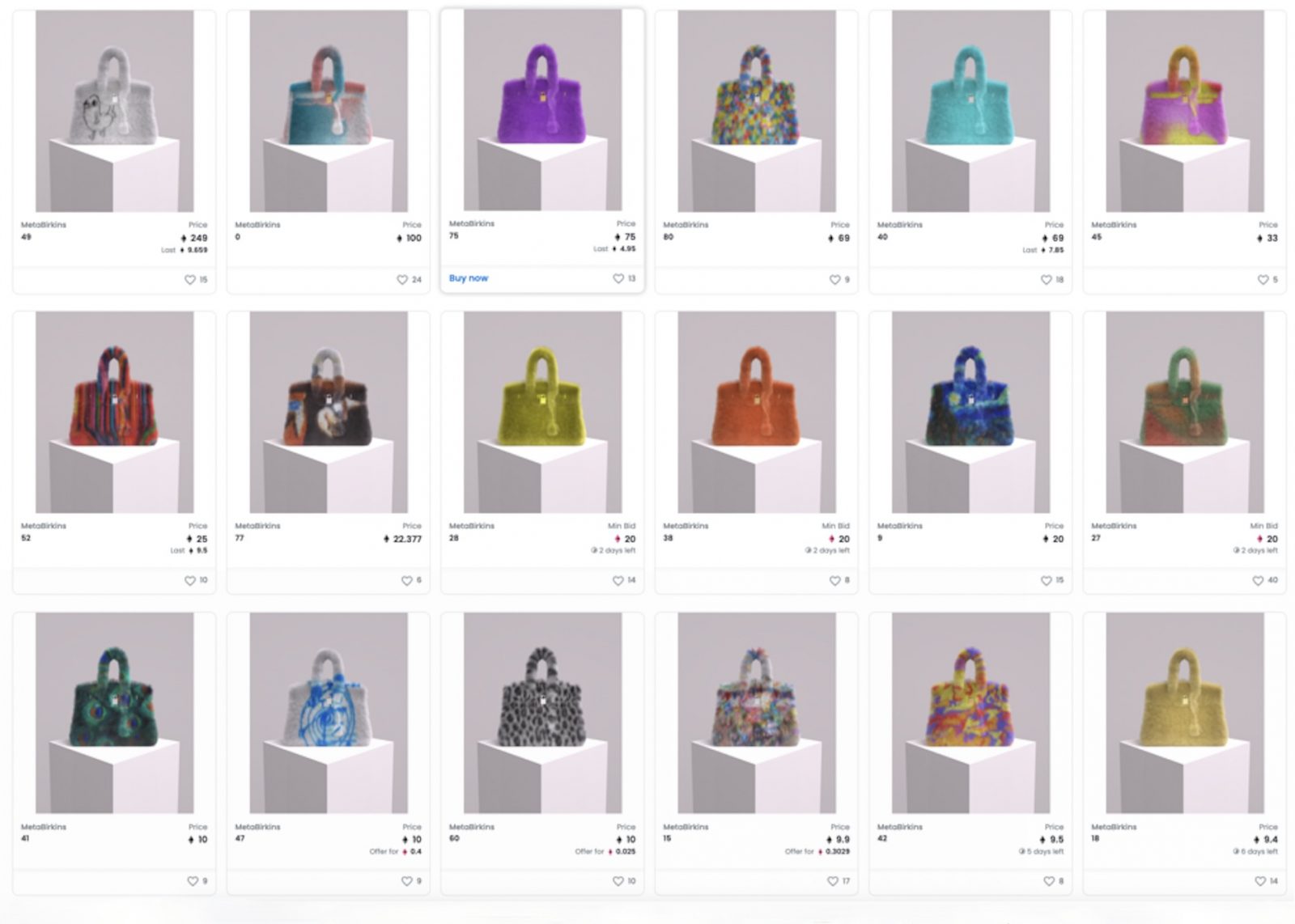 这位年轻艺术家于2021年12月举办的巴塞尔艺术展迈阿密海滩展会(Art Basel Miami Beach)期间发布了这一MetaBirkins数字手袋系列NFT,由100个“覆盖着皮草”的不同“铂金包”数字图像组成。当时,该系列每一个NFT起售价为0.1以太币,折合约为450美元。同时,Rothschild还可在NFT转售中获利(转售金额的7.5%)。据路透社报道,截自2022年1月初该系列销售额已超过100万美元。