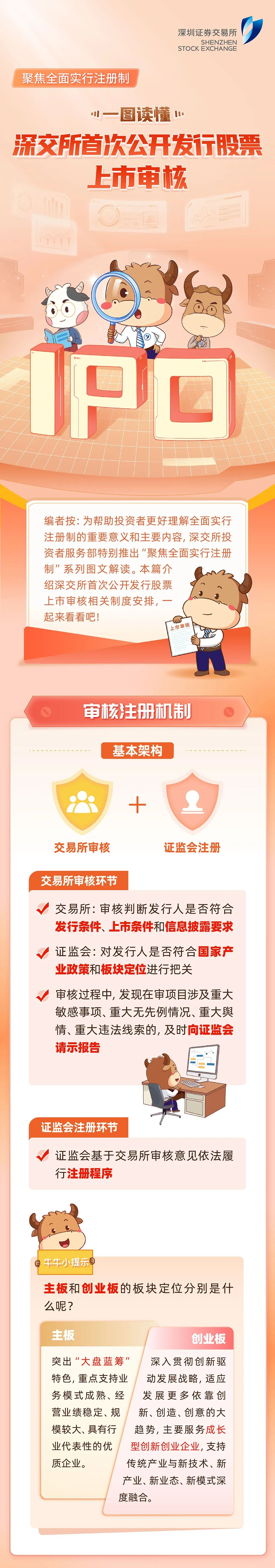 为帮助投资者更好理解全面实行注册制的重要意义和主要内容,深交所投资者服务部特别推出“聚焦全面实行注册制”系列图文解读。本篇介绍深交所首次公开发行股票上市审核相关制度安排,一起来看看吧!