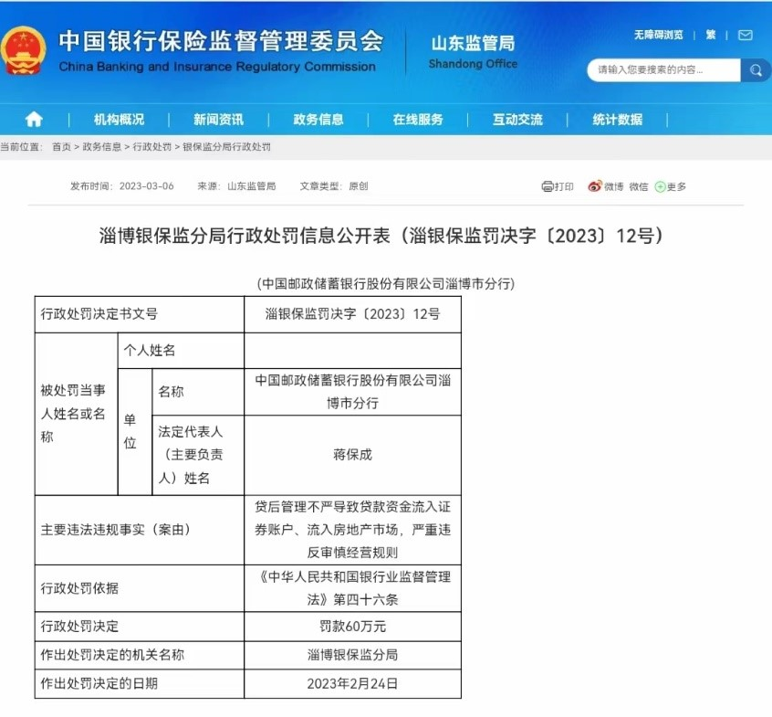 3月6日,中国银保监会山东监管局官网发布的行政处罚信息公开表(淄银保监罚决字〔2023〕12号)显示,中国邮政储蓄银行股份有限公司淄博市分行因存在贷后管理不严等违法违规事实,被罚款60万元。