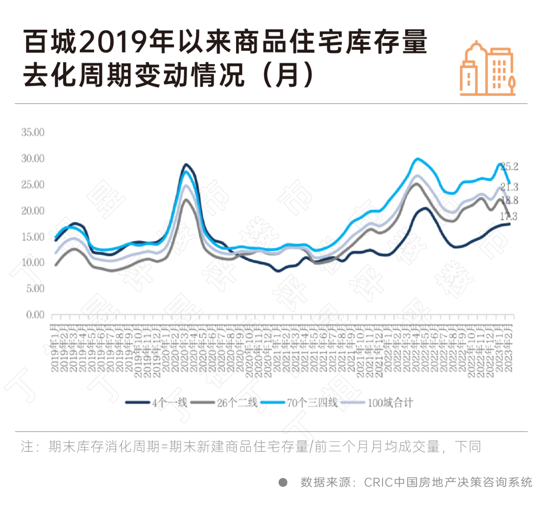 但一线城市受制于供应成交还处在低位运行,因此尽管库存规模环比下降,消化周期仍延续小幅抬升走势,由1月的17个月升至17.3个月。