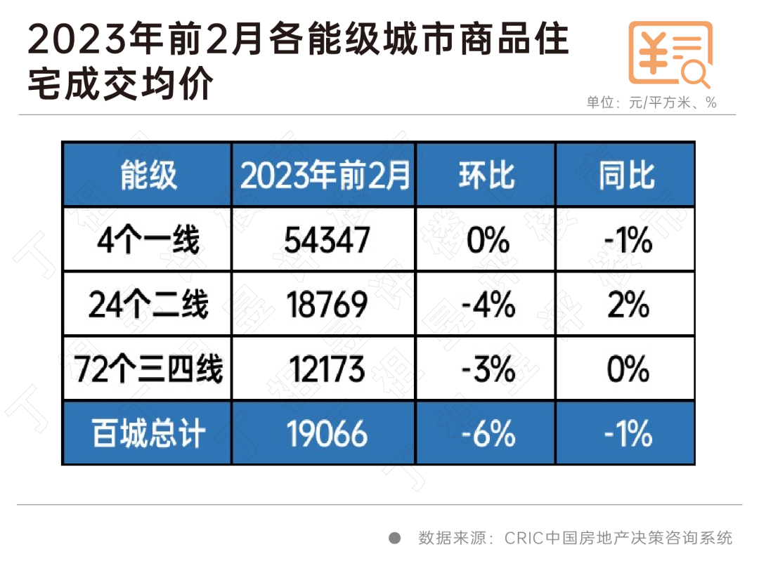 从CRIC监测的2023年1-2月百城新建商品住宅成交统计均价看,全国整体房价环比下降6%、同比下降1%。