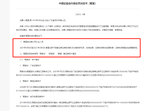 在任职期间,管宣实际控制并使用“周某华”“郑某英”“管萱”三个人名下的6个证券账户违规炒股。