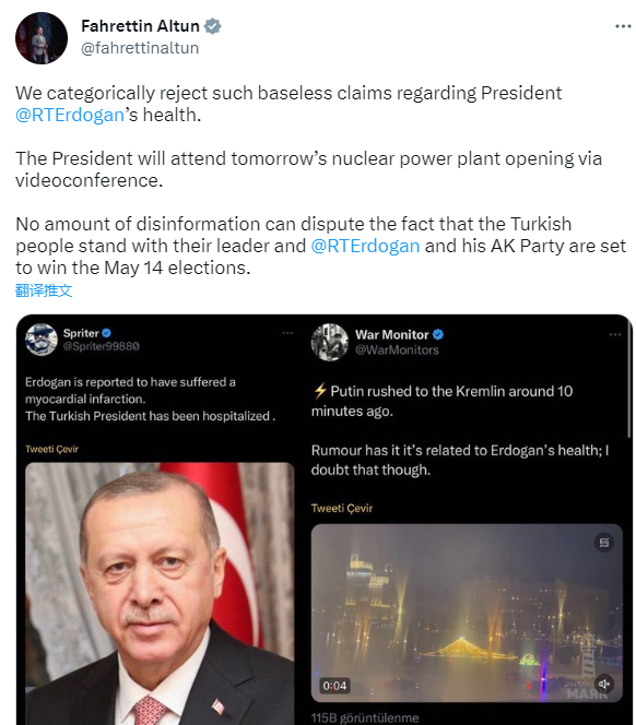事实上,一直到周四的核电站庆典前,埃尔多安都没有回到公众视野中。事实的空缺,给了揣测和谣言大展拳脚的空间。在网络上出现了大量“埃尔多安心肌梗死”、“普京深夜赶往克里姆林宫”的传言。面对网络舆情,土耳其总统办公室的新闻主管Fahrettin Altun也不得不在社交媒体上强调,这些都是毫无依据的谣言。