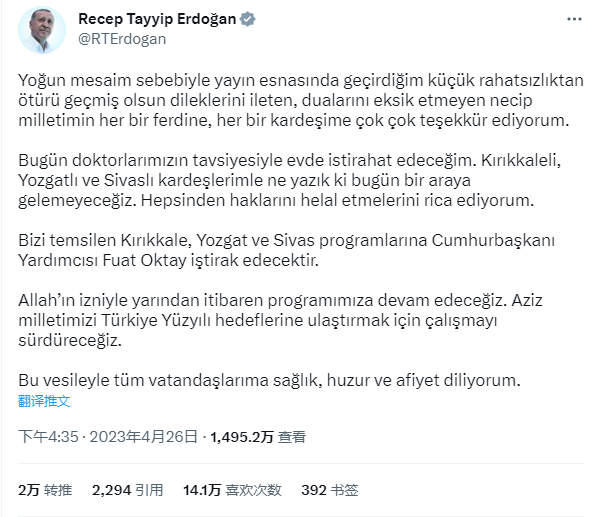 草草结束直播专访后,埃尔多安周三在社交媒体上做出更详细的解释,并宣布将会医生的建议下休息一天,由副总统代表他参加多场竞选活动。