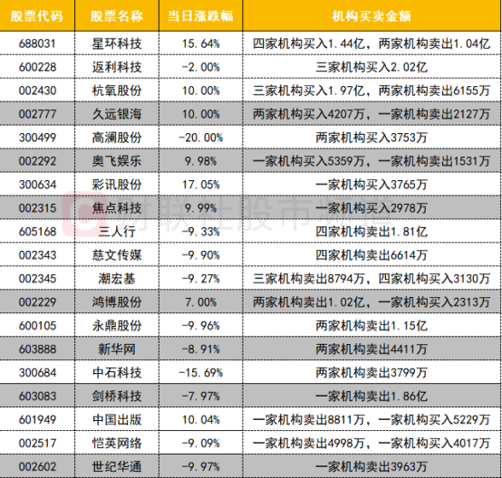 今日龙虎榜机构活跃度较高。其中AI概念股买入方面,数据要素概念股星环科技获机构买入1.44亿,同时遭机构卖出1.04亿,久远银海获机构买入超4000万,电商概念股返利科技获机构买入超2亿,液冷概念股高澜股份获机构买入超3000万,传媒股奥飞娱乐获机构买入超5000万,ChatGPT概念股彩讯股份获机构买入超3000万。卖出方面,传媒股三人行遭机构卖出1.81亿,慈文传媒遭机构卖出超6000万,CPO概念股永鼎股份遭机构卖出1.15亿,剑桥科技遭机构卖出1.86亿,ChatGPT概念股鸿博股份遭机构卖出超亿元,传媒股中国出版遭机构卖出超8000万,游戏股世纪华通遭机构卖出近4000万。