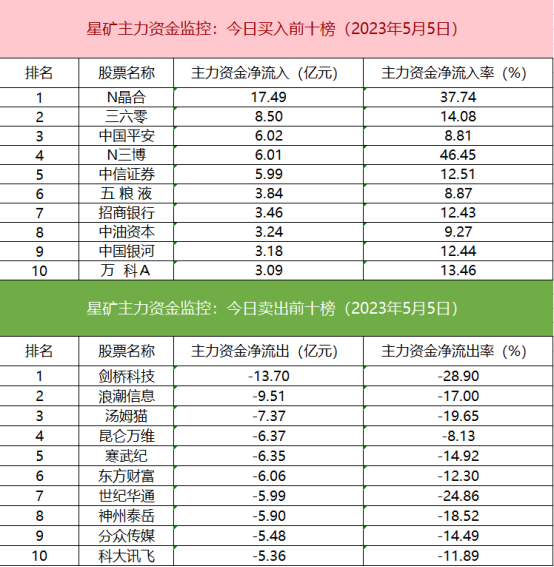 从个股主力资金监控数据来看,主力资金净流入前十的个股中中字头个股较多,N晶合净流入居首。