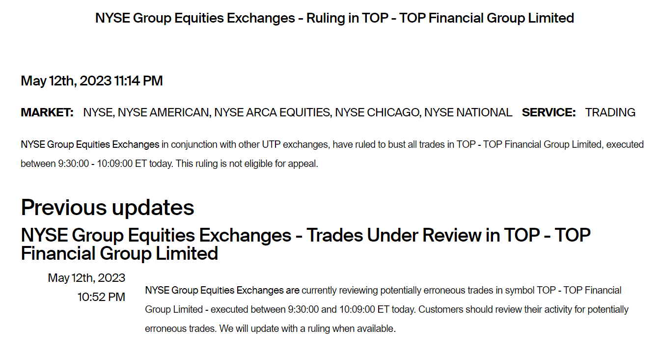 交易所也在第一时间确认出现错误。纳斯达克、纽交所等交易所11时许发布公告宣布,取消中阳金融股票在美东时间周五早9点30分至10点09分之间的交易。在股民社交平台,也有晒单显示今天的交易订单已经被撤销。