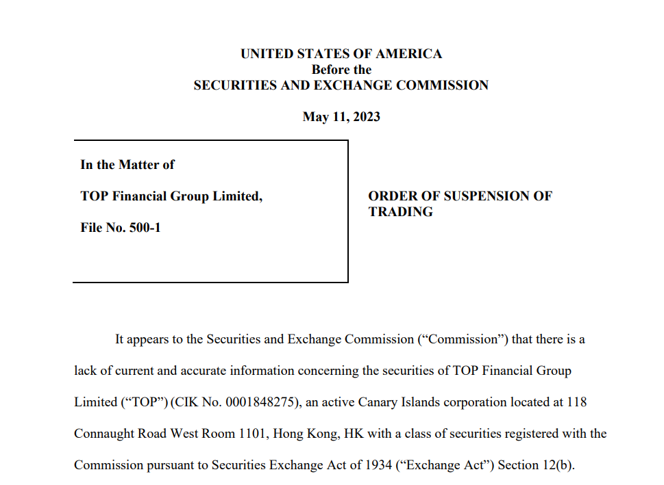财联社5月13日讯(编辑 史正丞)根据一份落款为5月11日的文件,美国证券交易委员会(SEC)发布行政命令,鉴于香港在线券商股中阳金融集团(TOP)的股价出现无法解释的剧烈波动,为了公众利益和保护投资者,援引《1934证券法》第12(k)条,下令中阳金融从美东时间5月12日开盘开始,一直到5月25日11点59分期间暂停交易。