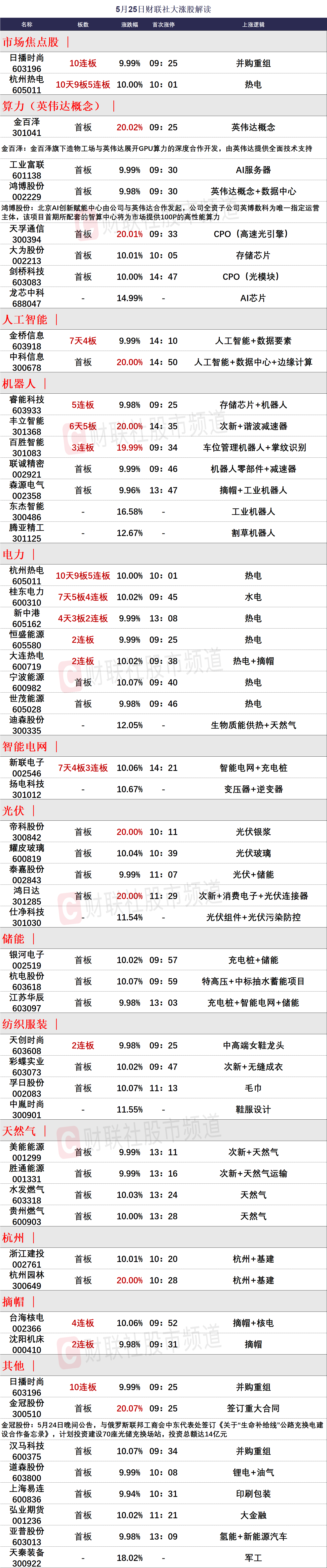 【5月25日涨停分析】今日共46股涨停,连板股总数12只,9股封板未遂,封板率为84%(不含ST股、退市股及未开板新股)。个股方面,并购重组的日播时尚10板,电力股杭州热电10天9板、桂东电力7天5板、新中港4天3板,机器人概念股睿能科技5板、丰立智能创业板6天5板、百胜智能创业板3板,ST摘帽的台海核电4板、沈阳机床2板,智能电网板块新联电子7天4板,人工智能概念股金桥信息7天4板。今日收涨个股2032只,收跌个股2738只。