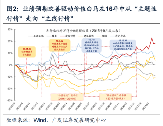 2016年中,伴随煤炭、钢铁等行业的实质性去产能政策细则发布,供给侧改革进入快车道,市场对于业绩改善预期的共识迅速形成。“估值填坑”行情得以全面扩散,2016第二季度期间估值低位的煤炭以及估值次低位的钢铁/建材/建筑装饰以更快的速度开启估值修复,进入“估值填坑”后期的主线行情。而在16年完成各行业估值修复后,价值白马股在17年“盈利牵牛”之下继续迎来估值扩张。