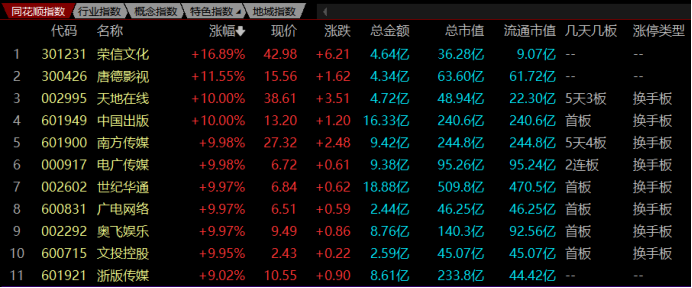 注:传媒股集体走强(截至14时左右)