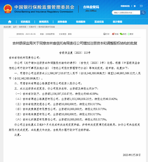 依据相关信息,本次注册资本变更后,吉林省财政厅仍为吉林信托第一大股东,出资额15.56亿元,持股比例49.4%;吉林省高速公路集出资额15.53亿元,持股比例49.3%;吉林省能源交通总公司、吉林炭素集团、吉林粮食集团、吉林化纤集团分别出资1000万元,占比0.3175%。