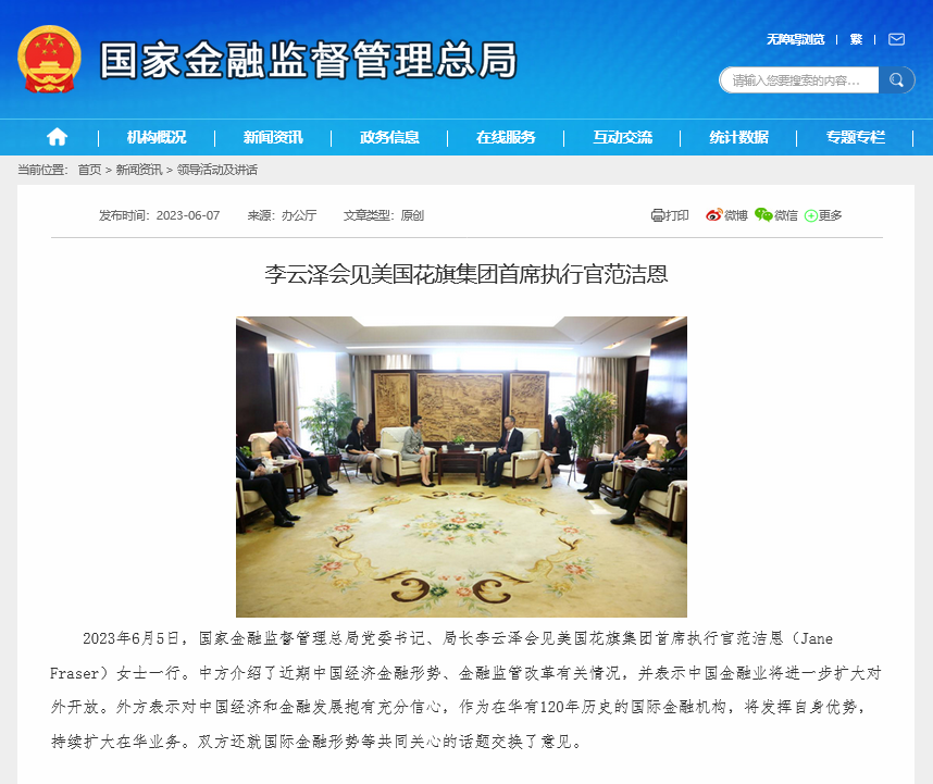 财联社6月7日讯(特约记者 许云峰)6月7日上午,国家金融监督管理总局发布的一则消息引发市场广泛关注:2023年6月5日,国家金融监督管理总局党委书记、局长李云泽会见美国花旗集团首席执行官范洁恩(Jane Fraser)女士一行。公开信息显示,范洁恩是李云泽履新国家金融监督管理总局后会见的首位外资银行高管。