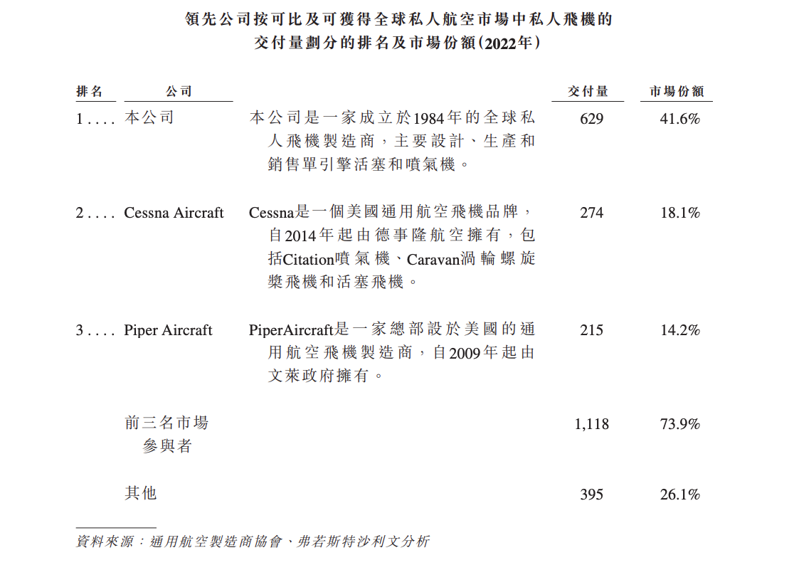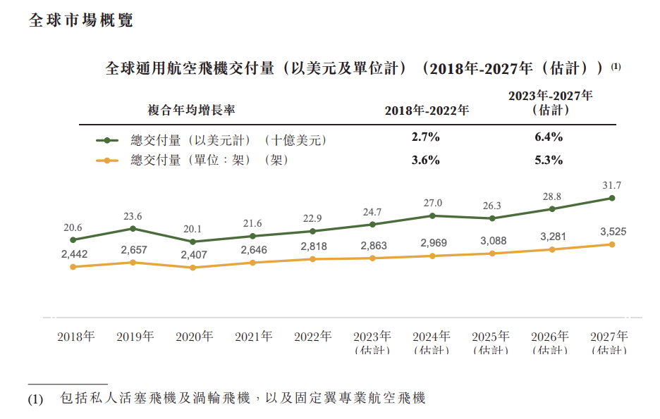 来自弗若斯特沙利文的资料,于2022年,全球通用航空飞机市场合共交付2818架新飞机,价值约230亿美元。