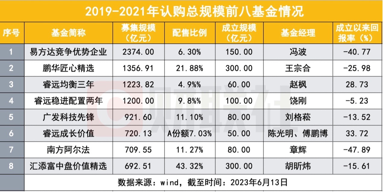 基金认购千亿规模的第一梯队几乎都诞生于此时间段。据财联社记者不完全统计,历史最高纪录保持者为2021年1月18日发行的易方达竞争优势企业混合型证券投资基金,该基金的资金认购总规模为2374亿元,由易方达明星基金经理冯波创下,成立规模为150亿,末日配售比例为6.3%。