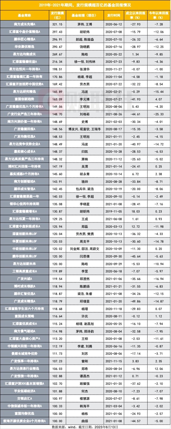 财联社记者统计显示,以成立规模来衡量,2019-2021年期间,共有54只主动管理型基金成立规模超过100亿。但是,这些产品也大都陷入困境。截至6月13日,平均收益率为-17.83%,仅有8只基金成立以来正收益,最差回报率为-49.86%,净值已然腰斩。
