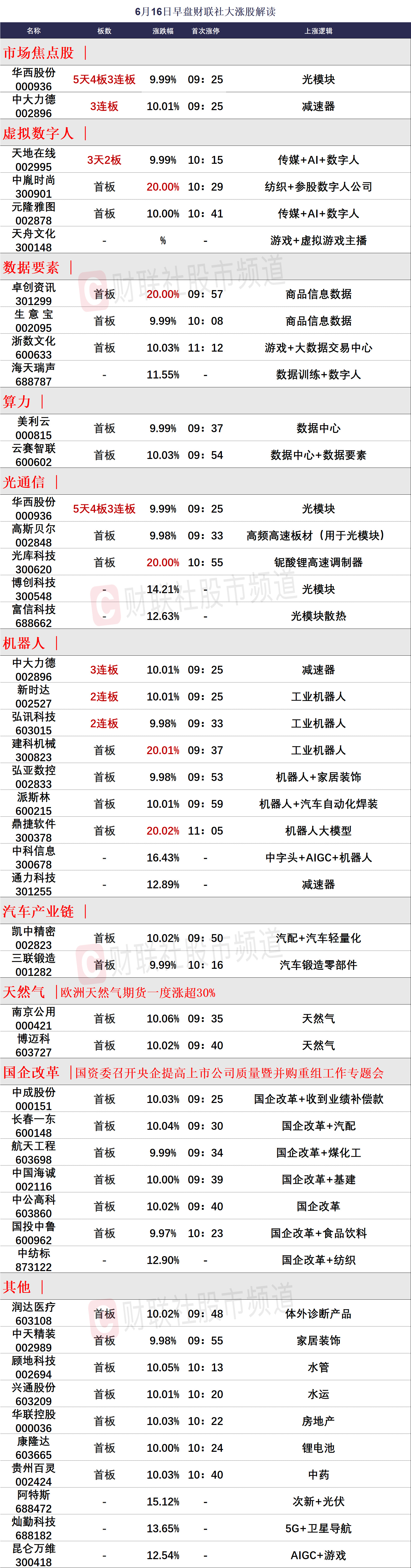 【6月16日午间涨停分析】今日午盘两市共35股涨停,连板股总数4只,16股封板未遂,封板率为69%(不含ST股、退市股及未开板新股)。个股方面,光通信板块华西股份5天4板、光库科技创业板首板,机器人概念股中大力德3板、新时达2板、弘讯科技2板,数字人板块天地在线3天2板、中胤时尚创业板首板。