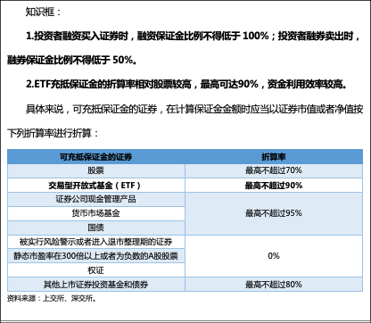 3. 折算率更高: 运用ETF作为担保物的折算率最高可达90%,高于普通股票最高的70%的折算率和其他大多数上市证券投资基金最高的80%的折算率,这样相等市值的担保物,ETF能融到更多资金,使用效率更高。