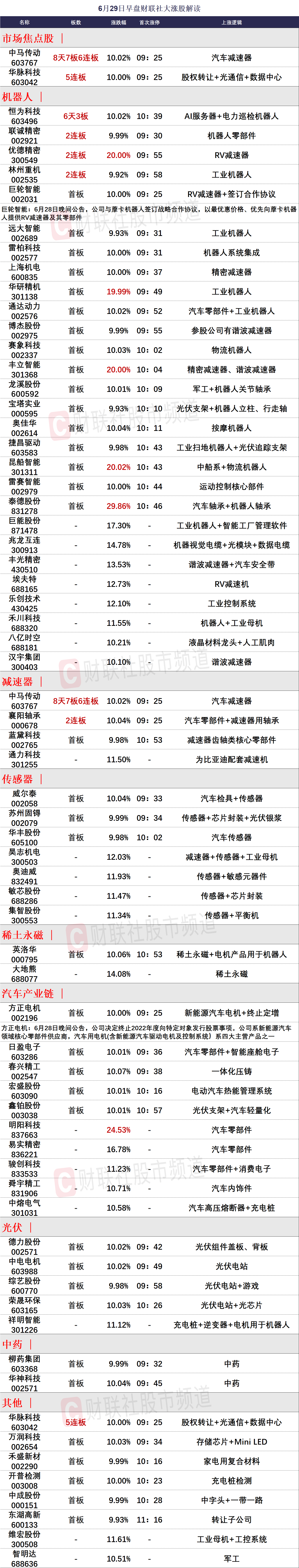 【6月29日午间涨停分析】今日午盘两市共44股涨停,连板股总数6只,10股封板未遂,封板率为81%(不含ST股、退市股及未开板新股)。个股方面,减速器概念股中马传动8天7板、襄阳轴承2板,股权转让的华脉科技5板,机器人概念股恒为科技6天3板、优德精密创业板2板、联诚精密2板、林州重机2板。