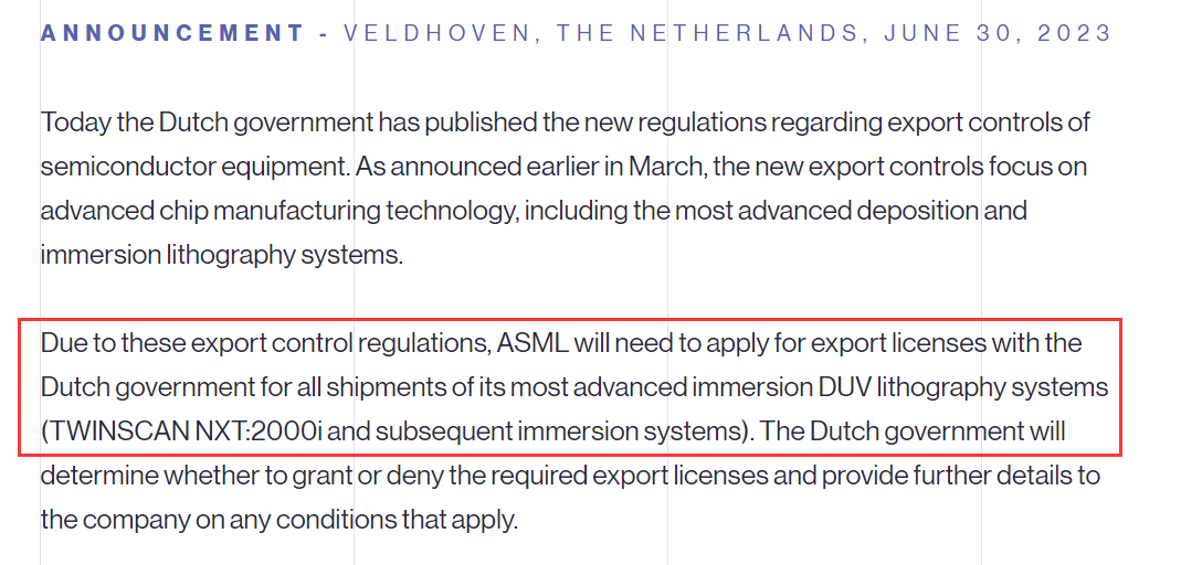 【ASML:目前最先进的浸润式DUV设备出口需获得荷兰政府许可】财联社6月30日电,荷兰光刻机巨头阿斯麦公司(ASML)官网发布声明称,荷兰政府当日公布关于半导体设备出口管制的新规定,将于2023年9月1日生效。根据新的出口管制规定,ASML将需要向荷兰政府申请其最先进的浸润式DUV光刻系统(TWINSCAN NXT:2000i及后续浸润式系统)的所有货物的出口许可证。荷兰政府将决定是否批准或拒绝所需的出口许可证,并就任何适用的条件向该公司提供进一步的细节。ASML提醒,其EUV系统销售已受到限制。其他ASML系统出货不受荷兰政府控制。
