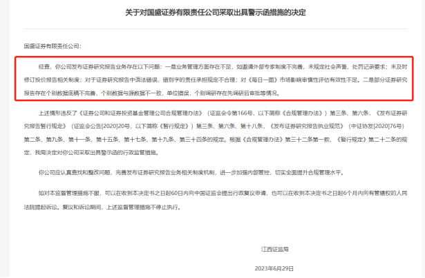 江西证监局查明,国盛证券发布证券研报业务存在以下问题。