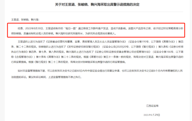 此外,江西证监局指出,2022年8月30日,王昱涵将制作的“每日一图”通过微信工作群向客户发送,造成不良影响。该图片产品发布之前,依次经过时任策略首席分析师张峻晓、质量控制和合规人员的审核。鞠兴海时任研究所副所长,为研究所合规质控总复核人。