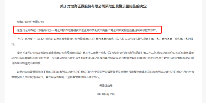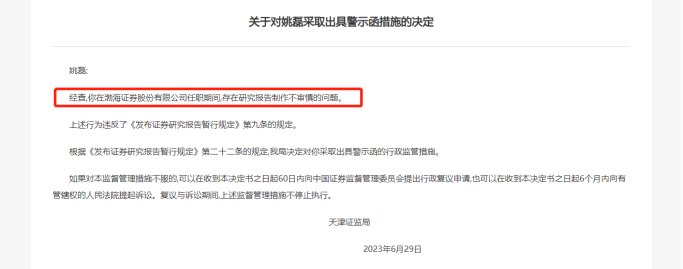 天津证监局指出,姚磊在渤海证券任职期间,存在研报制作不审慎的问题。渤海证券存在以下违规行为,一是公司发布证券研报业务有关制度不完善,二是公司研报质量控制审核把关不严。