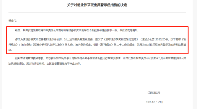 上述问题在对相关分析师等的罚单中有具体体现,经查,杨业伟作为某证券研报署名的证券分析师,国盛证券发布的该证券研报存在个别数据与源数据不一致、单位错误等情形。