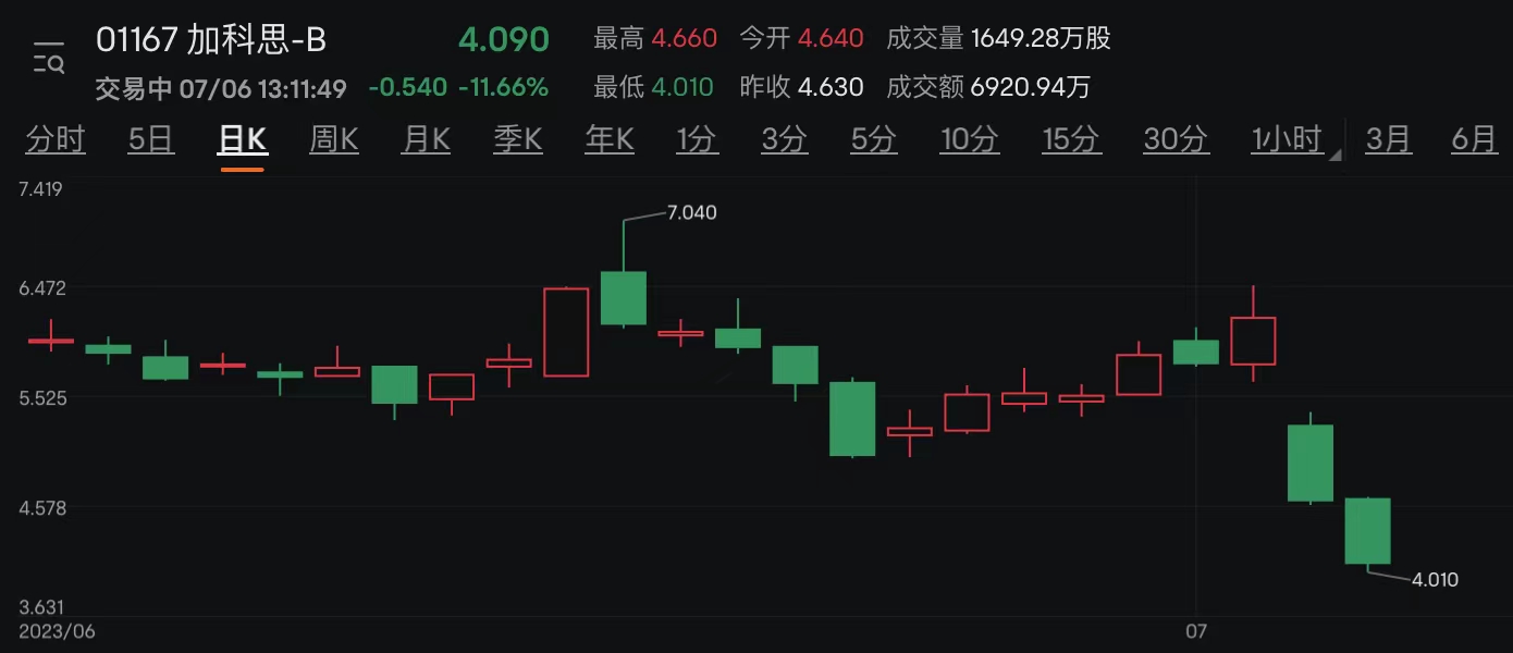 财联社7月6日讯(编辑 马轶杰)港股生物医药公司加科思-B(01167.HK)今日盘中再度跌超13%,截至发稿跌11.66%,本周该股已累跌超三成,仅两个交易日市值便蒸发逾17亿港元。