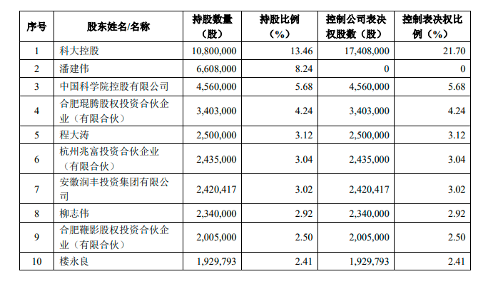 《科创板日报》记者注意到,一致行动协议到期终止前,科大控股、彭承志、程大涛、柳志伟、于晓风、费革胜、冯辉总计控制公司3215万股股份的表决权,占总股本的 40.08%。