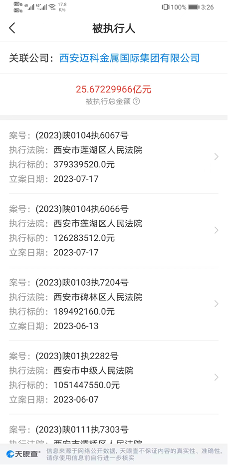 2023年5月29日,西安市碑林区人民法院发布裁定书,内容显示,冻结被申请人,迈科金属、何金碧、张春玲等多个机构及个人名下的银行存款4.4千万美元(约合人民币3.1亿),或查封、扣押等值的其他财产,申请人为中国农业银行股份有限公司西安永宁门支行。