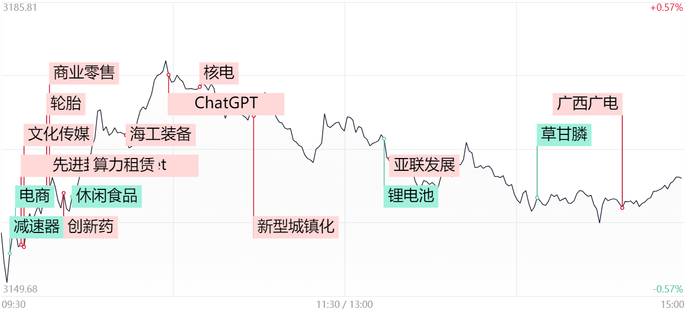 【昨日行情回顾】财联社7月25日电,上个交易日,三大股指集体低开,AI概念股一度展开反弹,带动股指集体翻红。但锂电池为首的新能源赛道、机器人板块持续低迷,拖累股指午后缩量探底,最终三大股指不同程度收跌。沪深两市成交额6589亿,较上周五缩量521亿,创年内次低。1)算力概念股早盘展开反弹,云赛智联、鸿博股份、竞业达涨停,曙光数创大涨超10%,浪潮信息盘中一度封板。天风证券研报指出,AI+数字经济共振的算力方向为长期受益主线,建议积极把握二季度绩优个股。2)ChatGPT概念为首的AI应用端同样活跃,焦点科技涨停,凡拓数创、华是科技大涨超10%。7月22日,OpenAI在推特宣布,下周将发布ChatGPT安卓APP,即日起可以在谷歌商店预约下载。3)基建以及房地产板块延续活跃态势,但盘中博弈异常激烈,领涨股以低位补涨为主。金科股份2连板,锦和商管、山水比德、深圳瑞捷、柯利达涨停。日前,国常会审议通过《关于在超大特大城市积极稳步推进城中村改造的指导意见》。4)医药板块盘中异动走强,创新药方向领涨,万方发展2连板,景峰医药涨停,三生国健涨近10%,百利天恒、海创药业、金迪克、百普赛斯等多股大涨超5%。近日,国家医保局发布《谈判药品续约规则》,建立基本覆盖药品全生命周期的支付标准调整规则,对达到8年的谈判药纳入常规目录管理。5)摘帽概念再度逆势走强,亚联发展“准地天板”,并录得7天4板,金正大、宏达新材、融发核电涨停。在市场整体成交持续低迷之际,部分活跃资金围绕低价低位股展开反复博弈。
