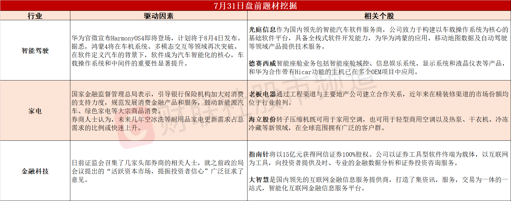 【盘前题材挖掘】①华为鸿蒙4计划于8月4日发布,其车机系统或将再次突破。②消费复苏、高温、政策多重驱动,家电更新需求或快速上升。③证监会就活跃资本市场征求意见,券商有望显著受益。