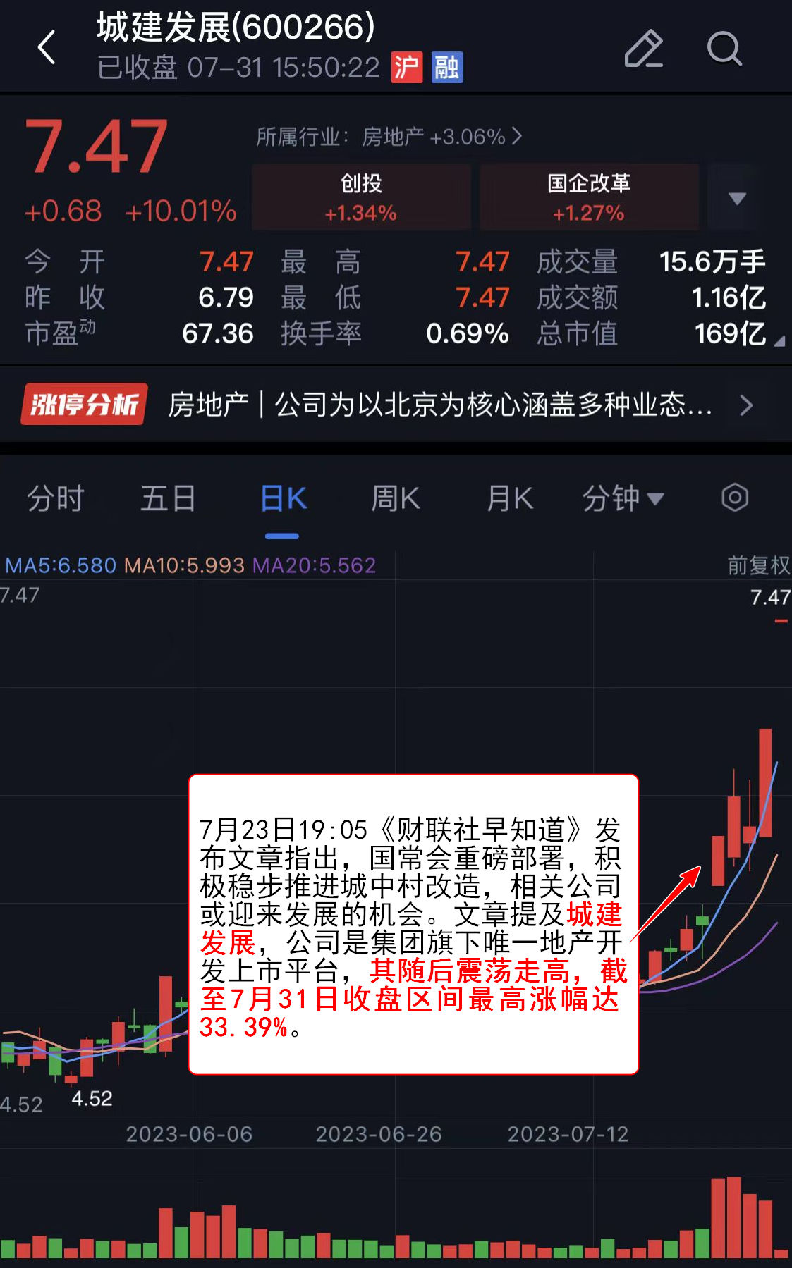 7月23日19:05《财联社早知道》 发布文章指出 ,国常会重磅部署,积极稳步推进城中村改造,相关公司或迎来发展的机会。文章提及城建发展,公司是集团旗下唯一地产开发上市平台,其随后震荡走高,截至7月31日收盘区间最高涨幅达33.39%。